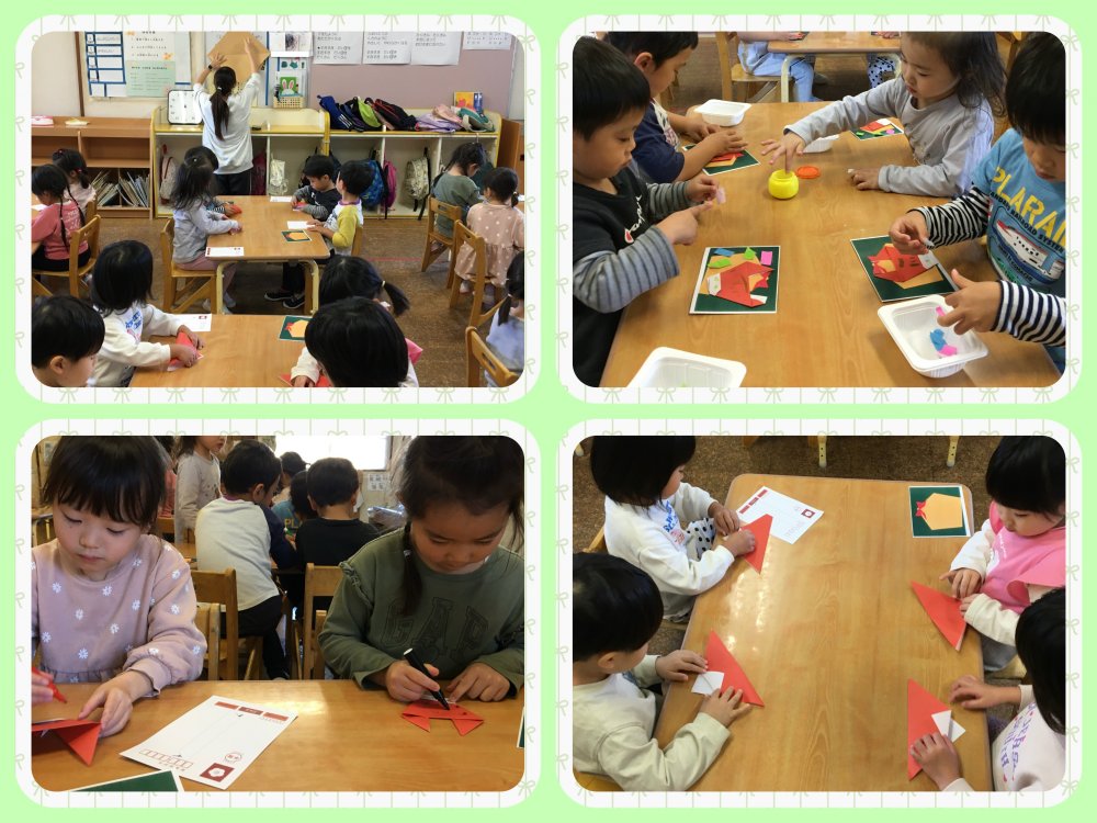 折り紙では角と角を合わせること、折った所をギュッとして折り目をつけるなど集中して取り組んでいました!